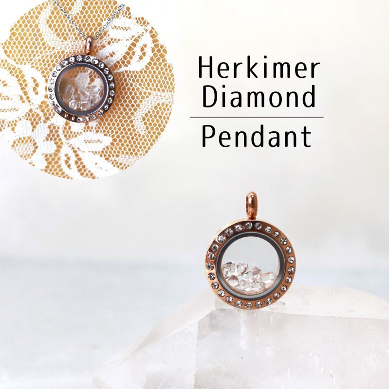 円型の金具ケースにハーキマーダイヤモンドの細石を閉じ込めたペンダントトップです。