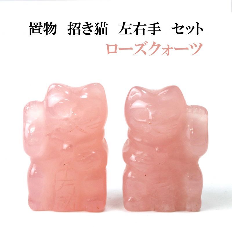 置物 彫り物 招き猫 左右手 セット ローズクォーツ 小 まねきねこ 千万両 開運 金運 恋愛 美しさ 品番:13527 [13527]