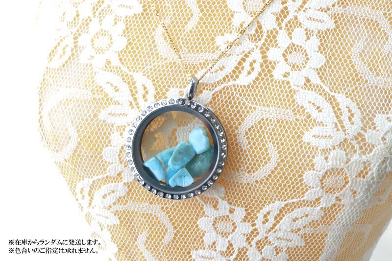 円型の金具ケースにラリマーの細石を閉じ込めたペンダントトップです。