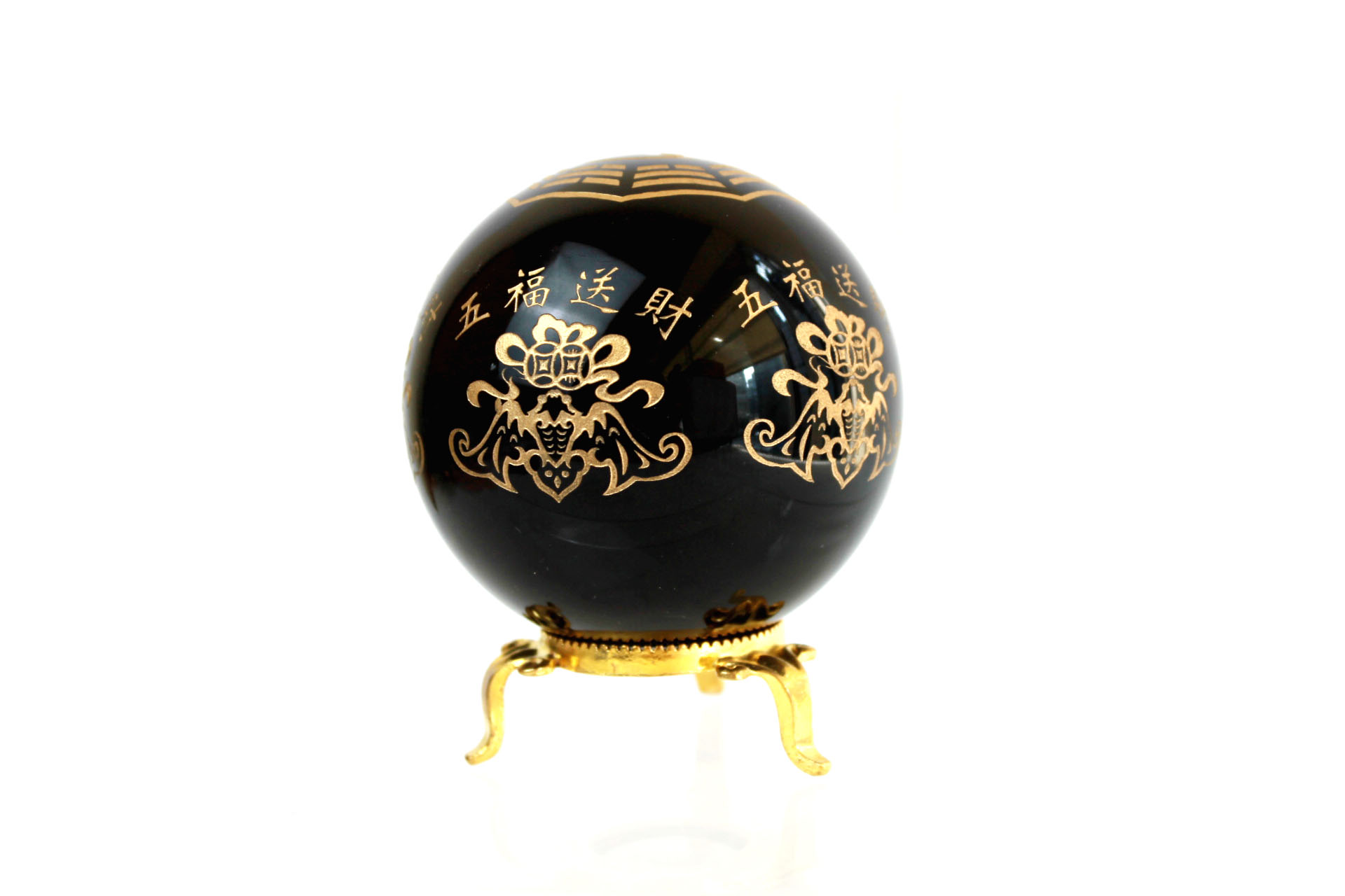 丸玉 オブシディアン 八卦対極・五福送財金彫刻 品番: 6726