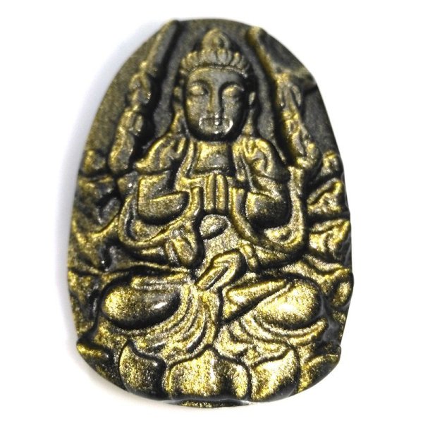 全面にゴールデンの輝きが見られるオブシディアンに八尊仏のお姿を立体的かつ緻密に彫刻しました。