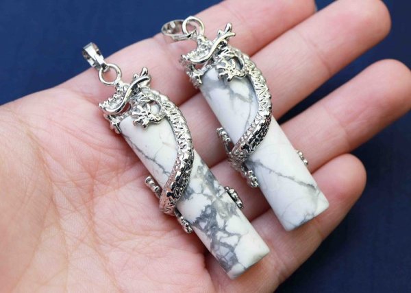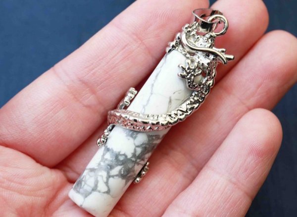 円柱の形をしたハウライトに龍を組み合わせたペンダントトップです。